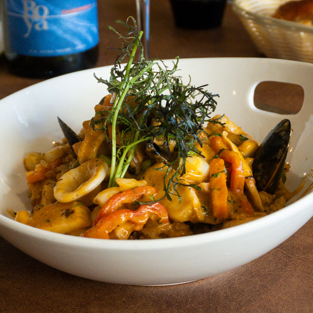 Mixtura de mariscos, cebolla en pluma, bañado con leche de tigre tradicional